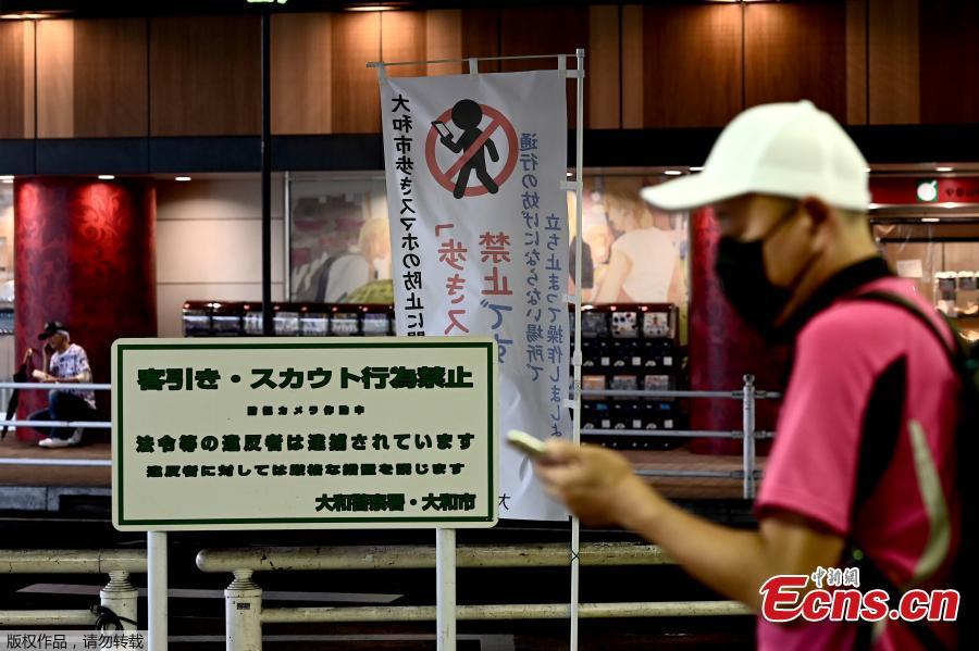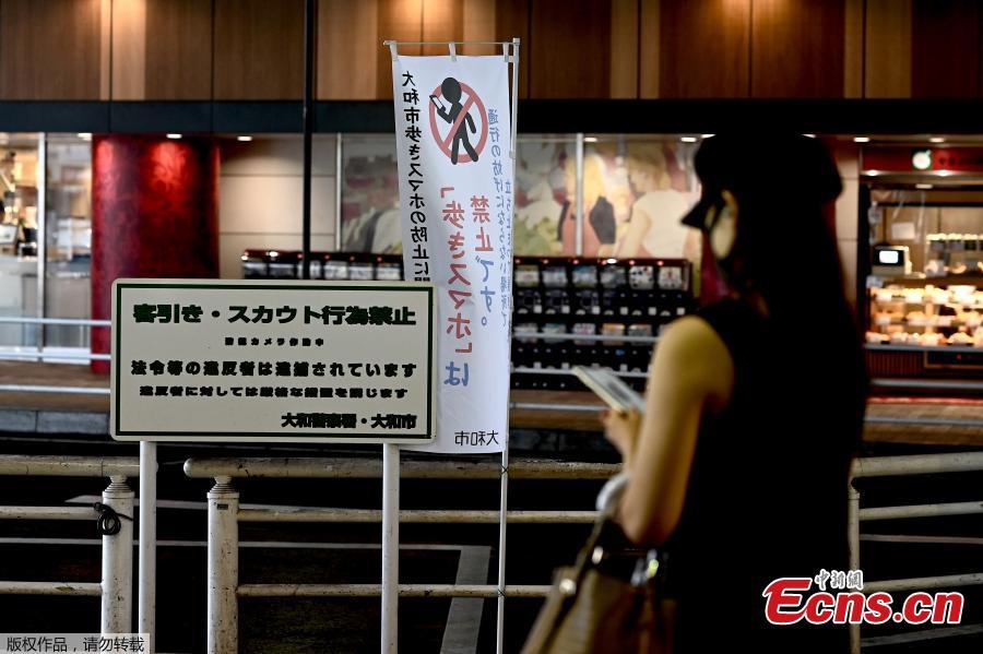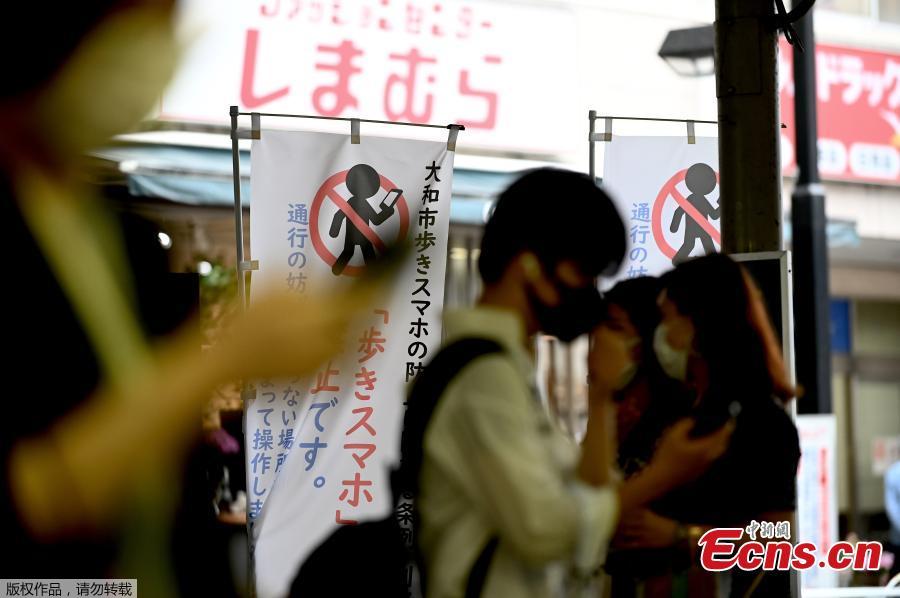 Multiple banners installed by the city hall to inform pedestrians about the ban on using a mobile phone while walking are seen in Yamato, Kanagawa prefecture, July 1, 2020. Japan's Yamato City imposed Japan's first ban on pedestrians from using smartphones while walking around the neighborhood's public roads, squares and parks. (Photo/Agencies)