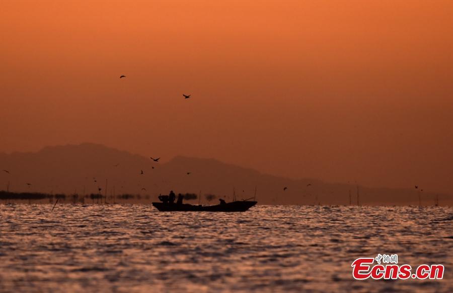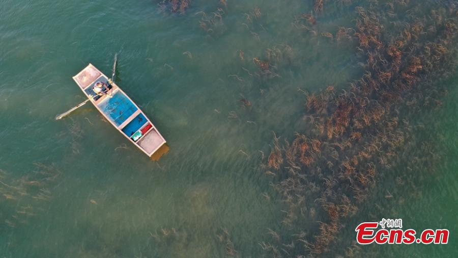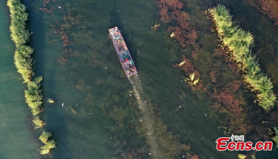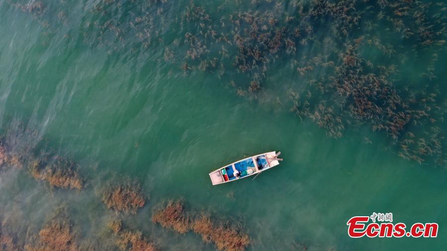 Aerial photo taken on July 1, 2020 shows a fishing boat sailing on the Bosten Lake in Bohu County, northwest China's Xinjiang Uygur Autonomous Region, after the 4-month fishing ban. Bosten Lake is China's largest inland freshwater lake and the biggest fishery base in Xinjiang.