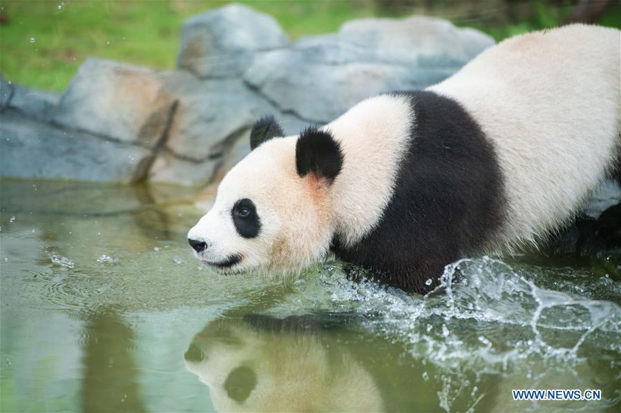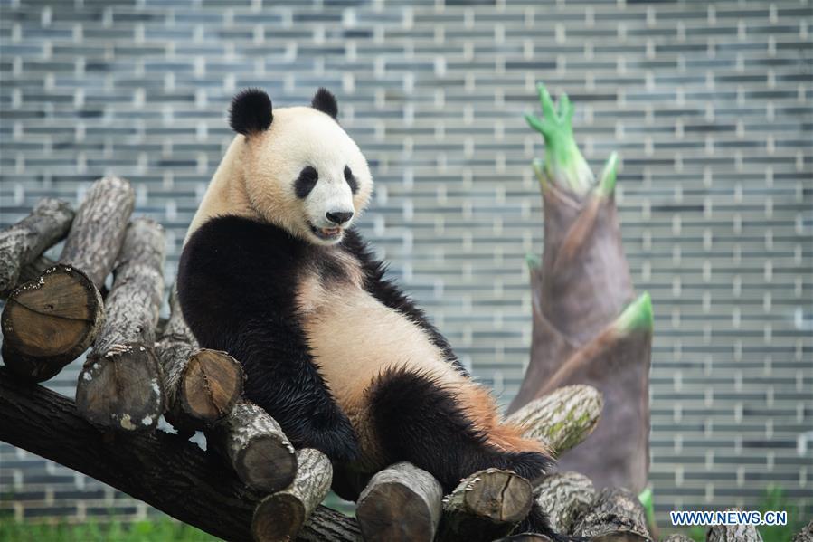 A giant panda is seen at a newly opened giant panda garden in Xiangxi Tujia and Miao Autonomous Prefecture, central China's Hunan Province, July 1, 2020. Eight giant pandas from southwest China's Sichuan Province made their debut at the garden on Wednesday. (Photo by Chen Sihan/Xinhua)