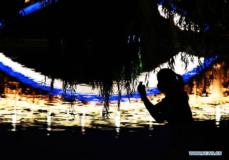 A visitor takes photos at the Daming Lake scenic spot at night in Jinan, capital of east China's Shandong Province, June 30, 2020. (Xinhua/Wang Kai)