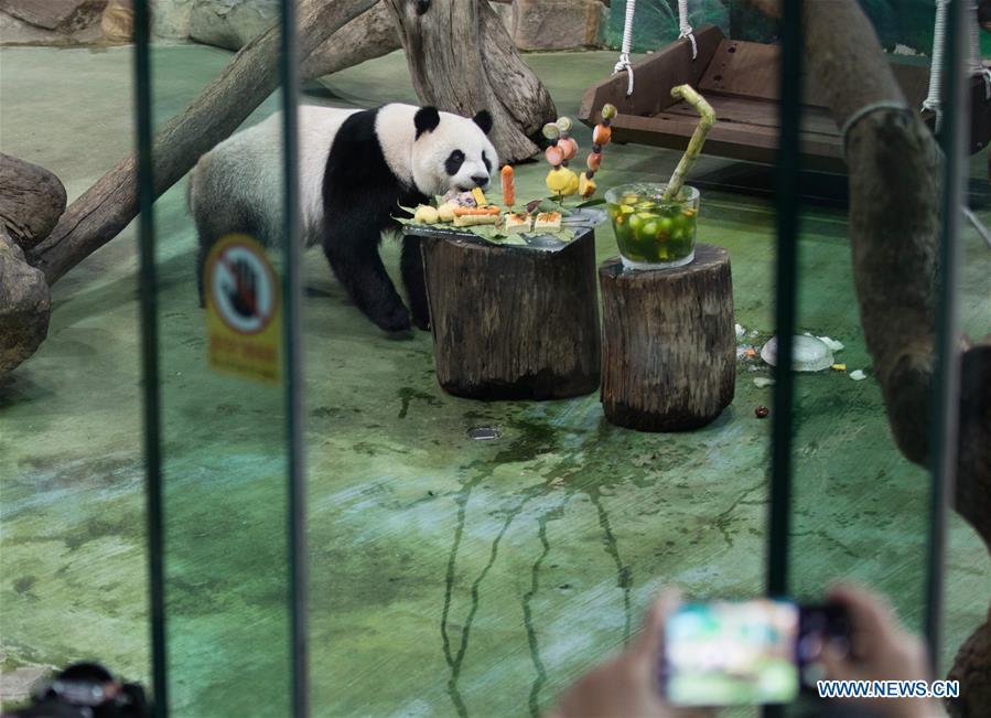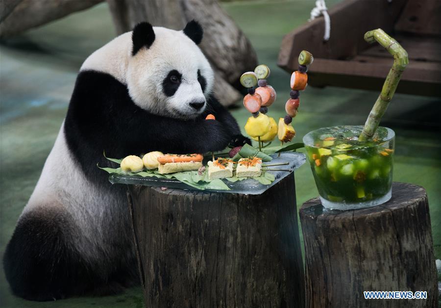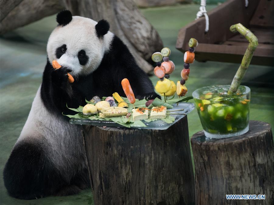 Giant panda Yuan Zai enjoys its special birthday cake at the Taipei Zoo in Taipei, southeast China's Taiwan, July 6, 2020. Yuan Zai, the female cub of giant panda Tuan Tuan and Yuan Yuan as goodwill gifts to Taiwan by the Chinese mainland, celebrated its seventh birthday in Taipei on Monday. (Xinhua/Jin Liwang)
