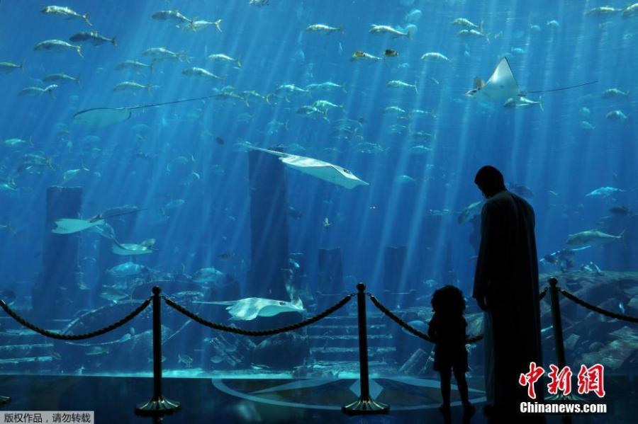A man with his daughter watch the aquarium in the Atlantis The Palm hotel, as the Emirates reopens to tourism amid the coronavirus disease (COVID-19) outbreak, in Dubai, United Arab Emirates July 7, 2020.