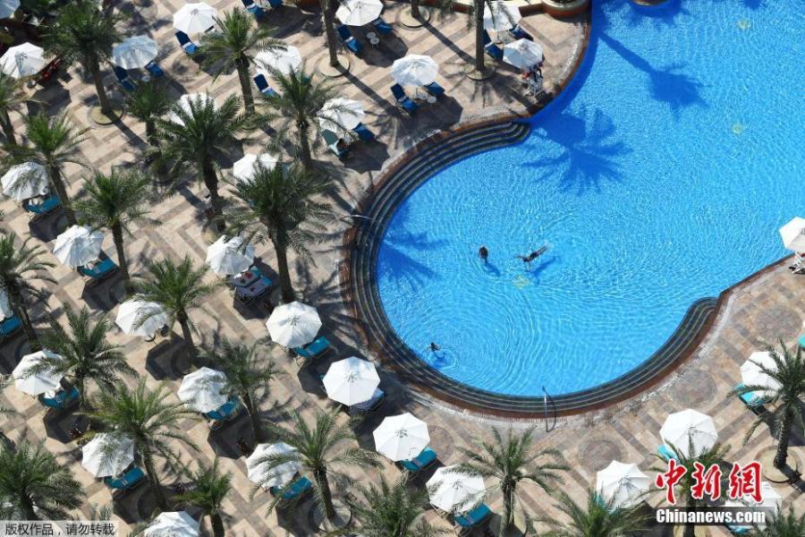People swim at a swimming pool in the Atlantis The Palm hotel, as the Emirates reopen to tourism amid coronavirus disease (COVID-19), in Dubai, United Arab Emirates July 7, 2020.
