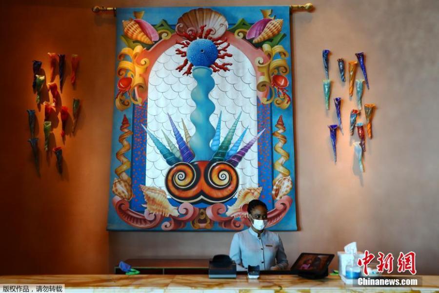 A hotel receptionist wearing a face mask is seen in the Atlantis The Palm hotel, as the Emirates reopens to tourism amid the coronavirus disease (COVID-19) outbreak, in Dubai, United Arab Emirates July 7, 2020.