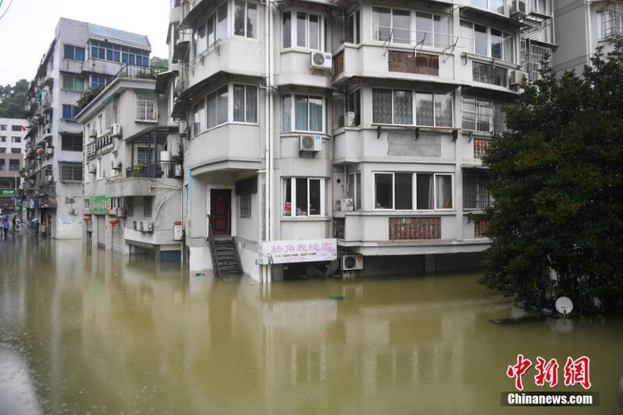 Photo taken on July 8, 2020 shows inundated residential buildings in Jiande of Hangzhou City, east China's Zhejiang Province. Some areas in Jiande have been inundated since the Xin'an River Reservoir, an important flood control project in the upper reaches of the Qiantang River, started discharging floodwater. (Photo/China News Service)
