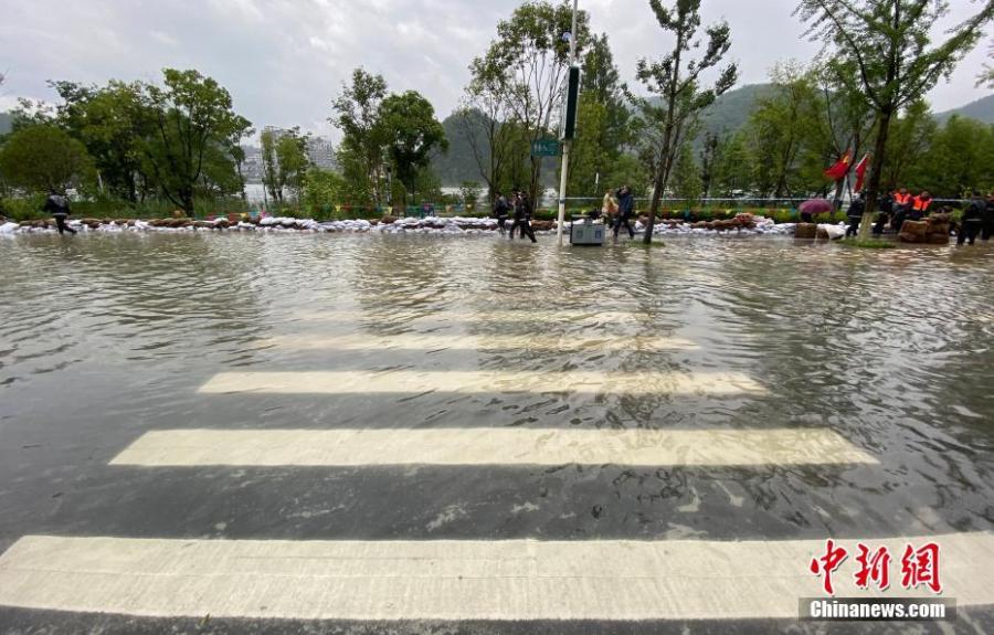 Photo taken on July 8, 2020 shows a waterlogged road in Jiande of Hangzhou City, east China's Zhejiang Province. Some areas in Jiande have been inundated since the Xin'an River Reservoir, an important flood control project in the upper reaches of the Qiantang River, started discharging floodwater on Tuesday. (Photo/China News Service)