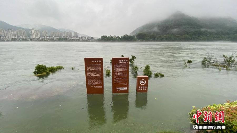 Photo taken on July 8, 2020 shows signs along the Xin'an River in Jiande of Hangzhou City, east China's Zhejiang Province. Some areas in Jiande have been inundated since the Xin'an River Reservoir, an important flood control project in the upper reaches of the Qiantang River, started discharging floodwater on Tuesday. (Photo/China News Service)