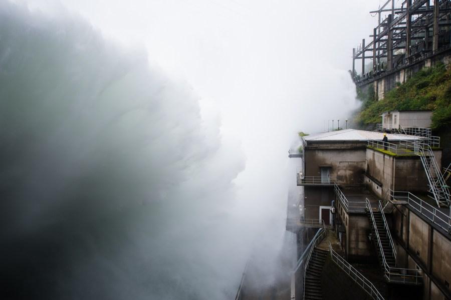 A staff member inspects the dam as water gushes out from spillways at Xin'an River Reservoir in east China's Zhejiang Province, July 8, 2020. (Xinhua/Weng Xinyang)
