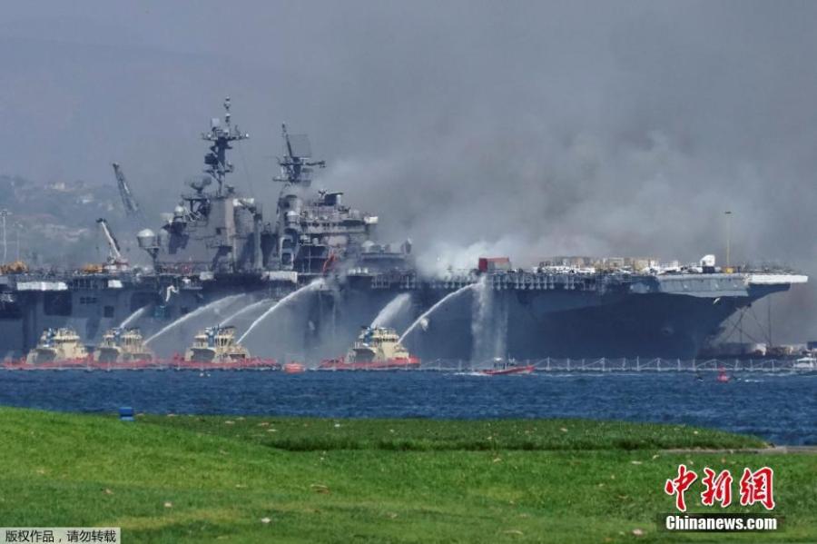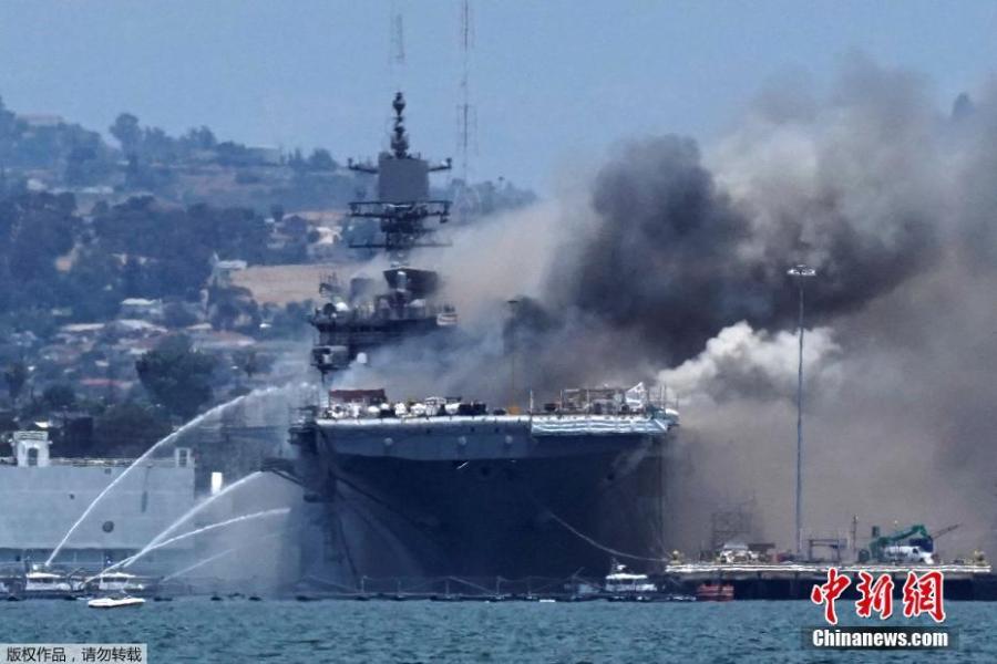 Firefighting boats spray water onto the U.S. Navy amphibious assault ship USS Bonhomme Richard as smoke rises from a fire onboard the ship at Naval Base San Diego, as seen from Coronado, California, U.S., July 12, 2020. A total of 21 people, including 17 sailors and four civilians, were injured Sunday morning in a fire on a U.S. Navy ship at Naval Base San Diego in California (Photo/Agencies)