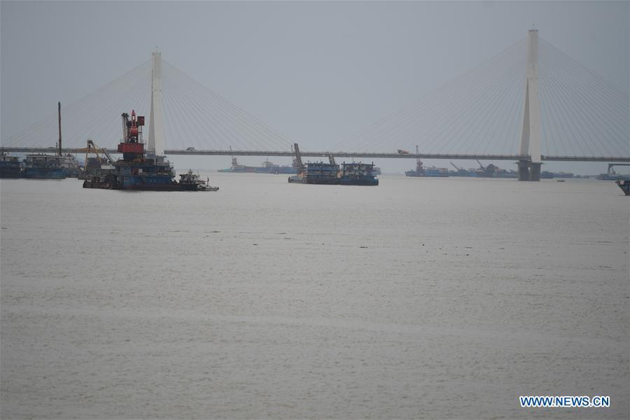 Photo taken on July 12, 2020 shows the main waterway of Dongting Lake, with water level surpassing the guaranteed level, in Yueyang City, central China's Hunan Province. Water at one of the hydrological stations at China's second-largest freshwater lake has exceeded the guaranteed level due to continuous rainfalls and upstream inflows. At about 3 a.m. on Sunday, water at the Chenglingji hydrological station of Dongting Lake, in central China's Hunan Province, reached 34.56 meters, 0.01 meters higher than the guaranteed level, and 2.06 meters higher than the warning level, according to local authorities. (Xinhua/Chen Zeguo)