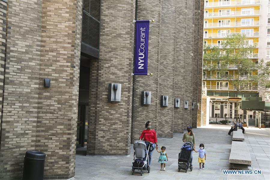 Pedestrians walk past a building of New York University in New York, the United States, July 14, 2020. The U.S. government has rescinded a new rule that could have denied international students their stay in the country if they only attend online courses in the coming fall semester, a federal judge in Boston, Massachusetts said Tuesday. (Xinhua/Wang Ying)