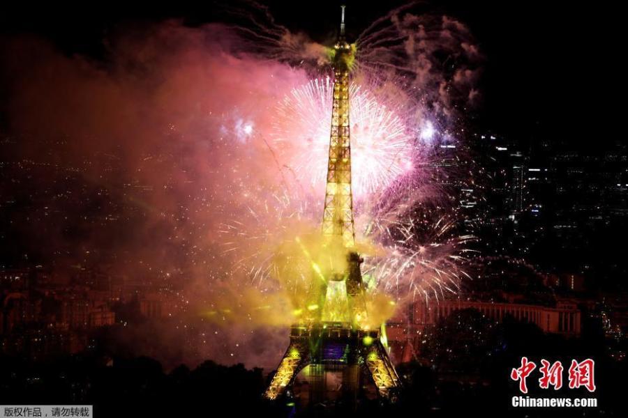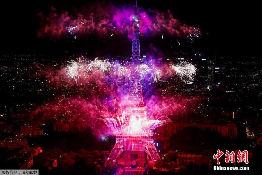 Fireworks explode near the Eiffel Tower during the Bastille Day celebrations in Paris, France, July 14, 2020. For this year's celebration, the military parade, which traditionally attracted huge crowds, was cancelled for the first time since 1945 and replaced by a downsized defile in the Place de la Concorde square in central Paris. (Photo/Agencies)