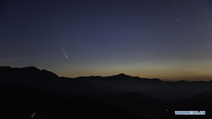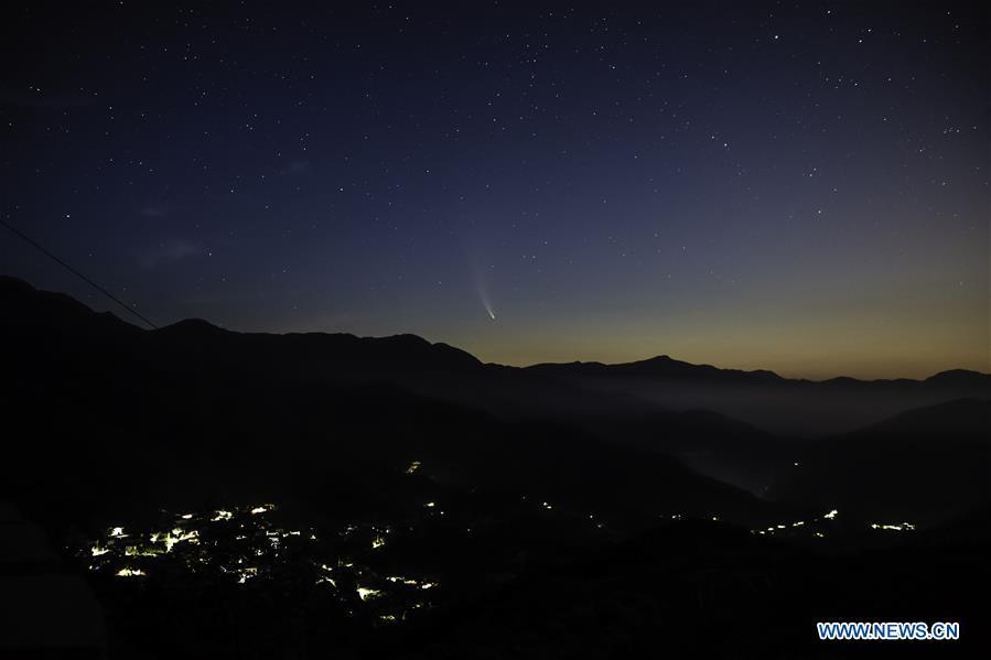 Photo taken on July 16, 2020 shows Comet NEOWISE in the sky over a suburb of Beijing, capital of China. (Xinhua/Meng Dingbo)