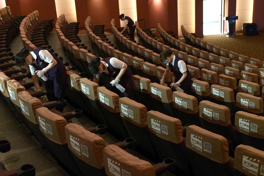 Staff members disinfect the seats at a movie theater in Shanghai, east China, July 19, 2020. (Xinhua/Ren Long)