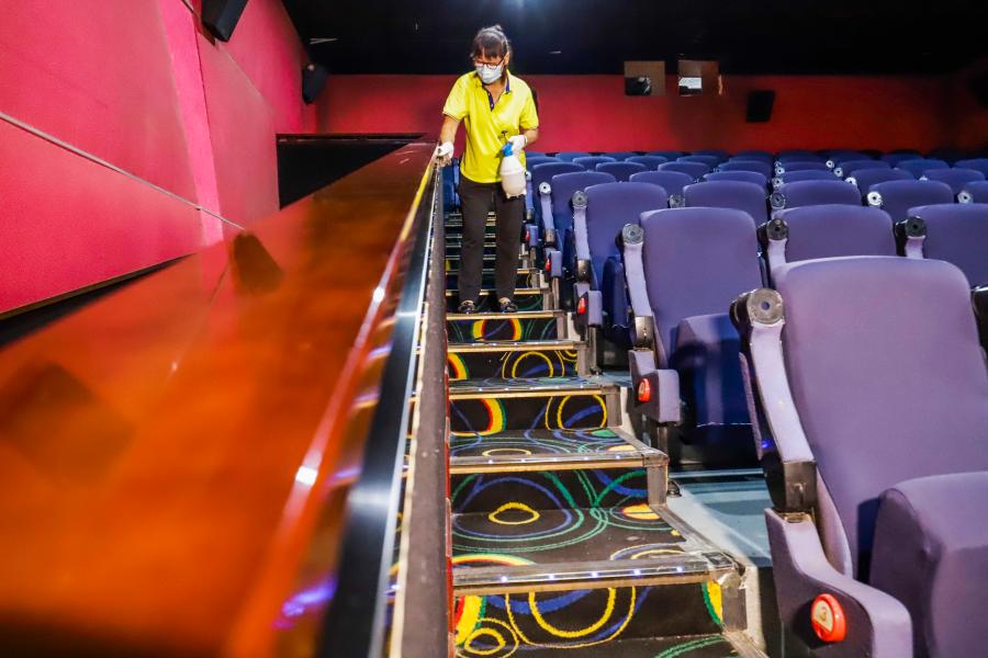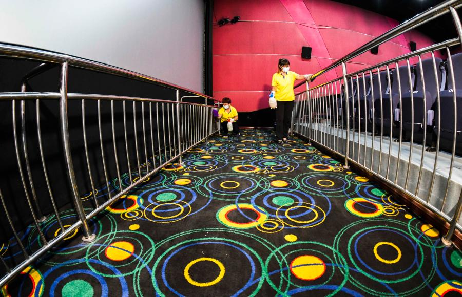 Staff members disinfect the handrails at a movie theater in Zunhua, north China's Hebei Province, July 19, 2020. (Photo by Liu Mancang/Xinhua)