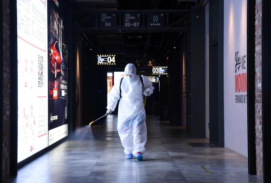 A staff member disinfects the corridor at a movie theater in Handan, north China's Hebei Province, July 19, 2020. (Photo by Hao Qunying/Xinhua)