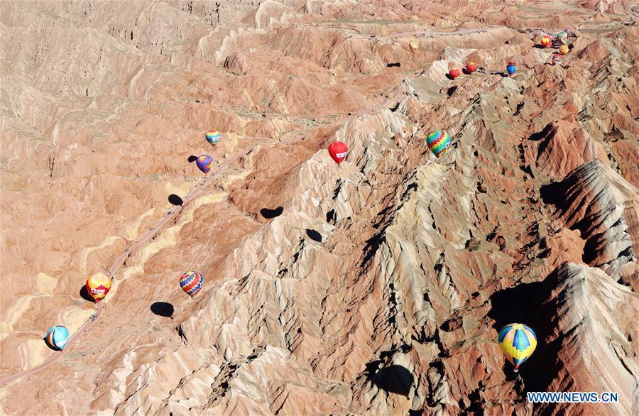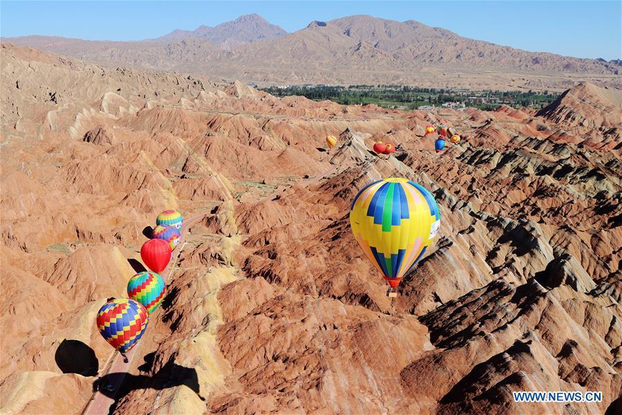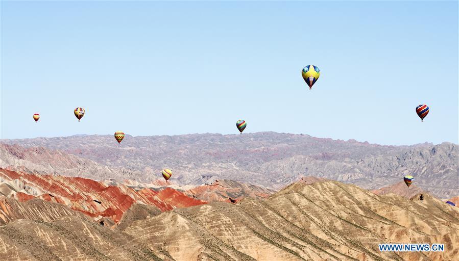 Hot air balloons are seen in the sky at Danxia National Geological Park in Zhangye, northwest China's Gansu Province, July 26, 2020. An international hot air balloons festival opened here on Sunday. A total of 100 hot air balloons will bring performances during the festival. (Photo by Cheng Lin/Xinhua)
