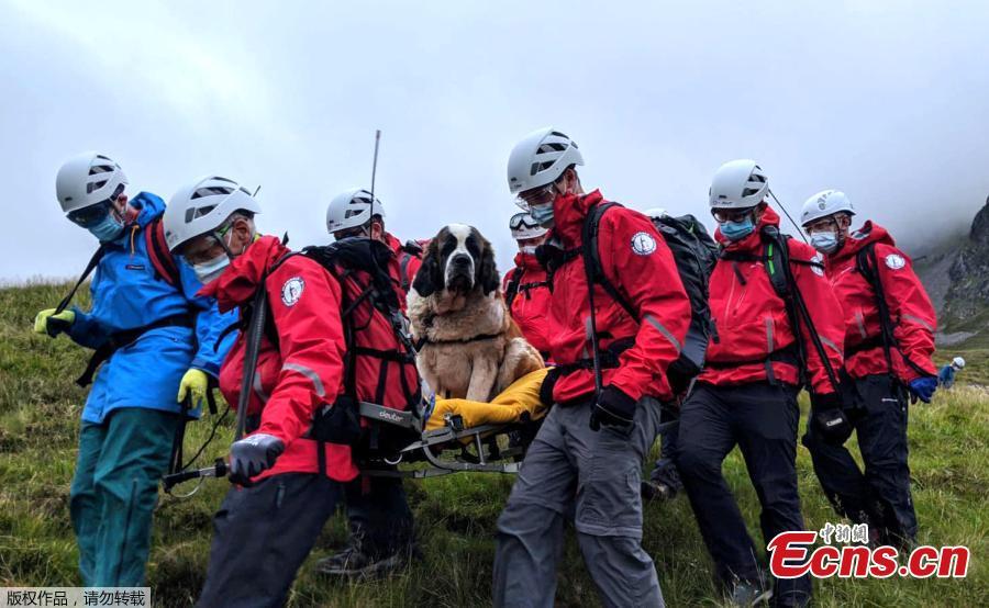 A St. Bernard dog Daisy is being strapped to a stretcher by a rescue team member during a rescue action in Brown Tongue, Scafell Pike, Cumbria, Britain July 24, 2020. (Photo/Agencies)