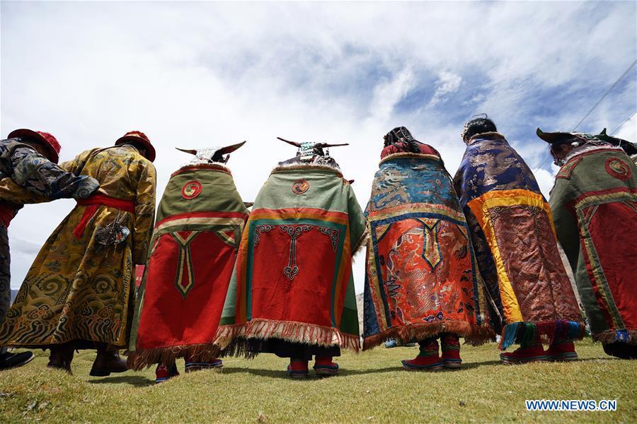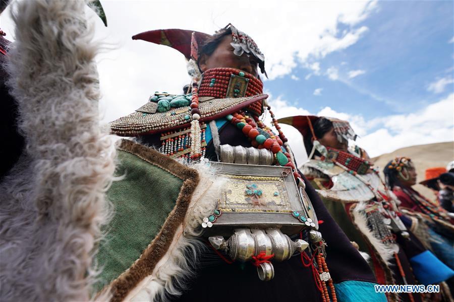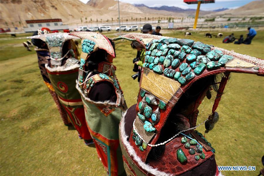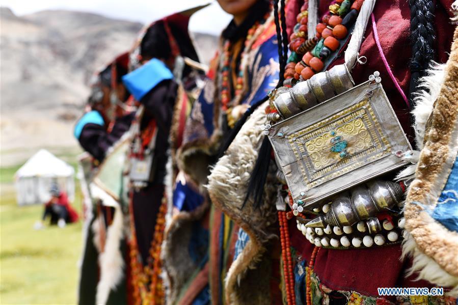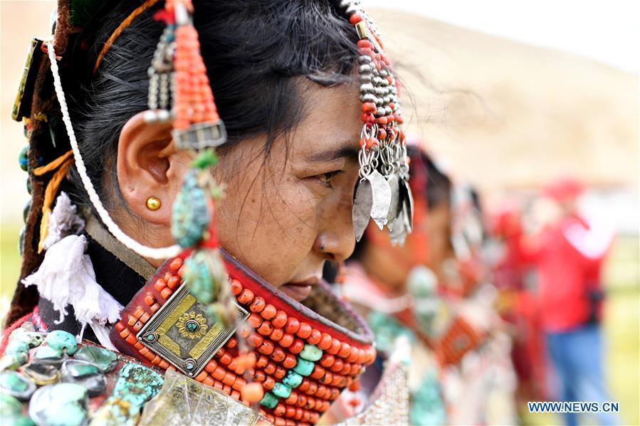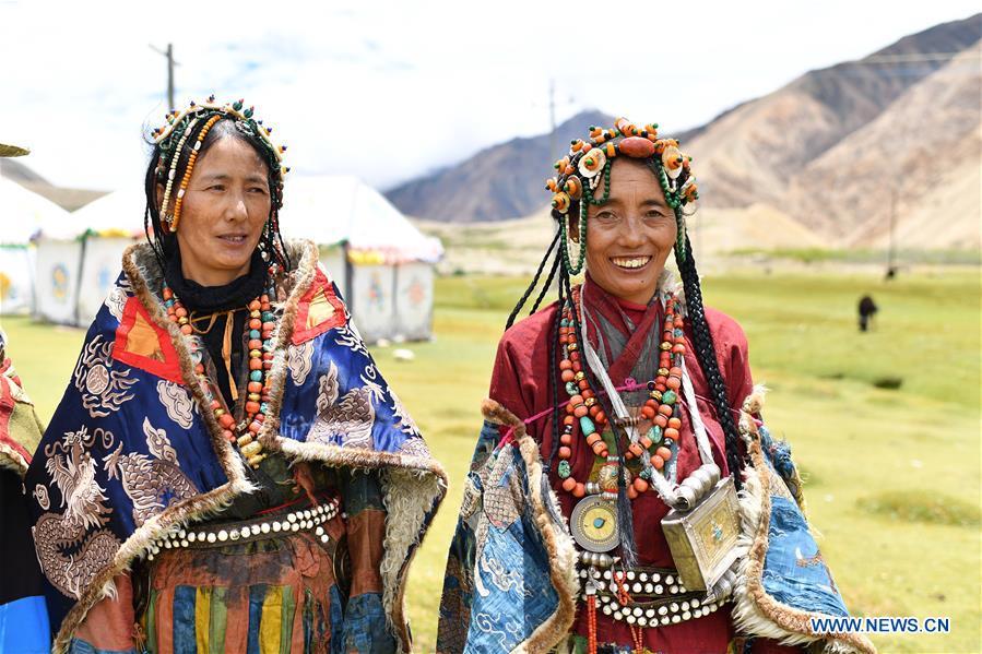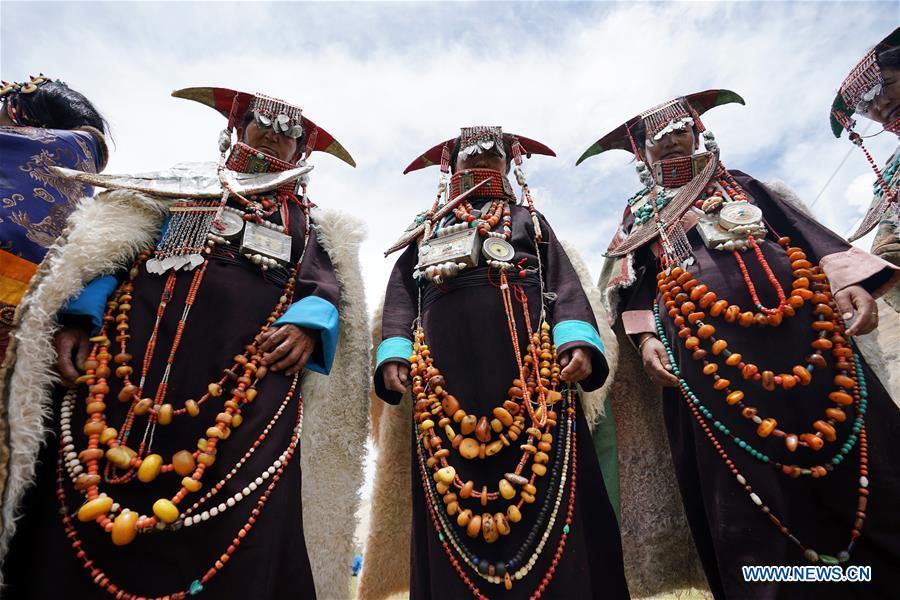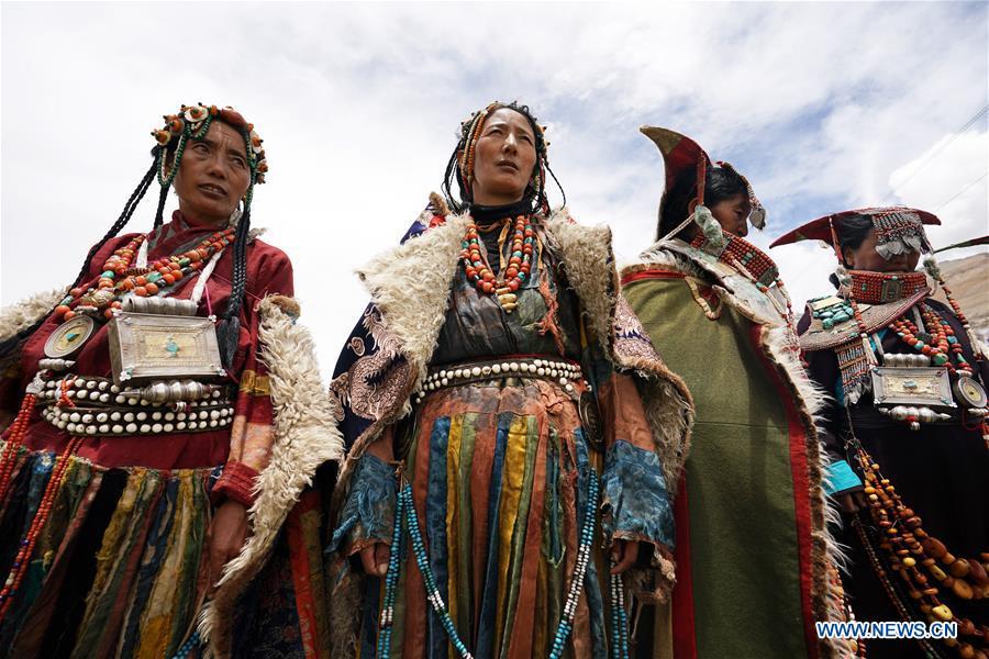 People wearing Burang clothes are seen in Burang County of Ali, southwest China's Tibet Autonomous Region, July 28, 2020. Burang clothes, decorated with gold, silver, pearls and other jewels, has a history of more than 1,000 years. (Xinhua/Zhan Yan)