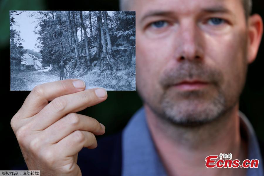 Researcher Wouter van der Veen, scientific director at the Institut Van Gogh, shows a copy of the postcard (around 1905-1910)that enabled him to identify the location that inspired Dutch painter Vincent van Gogh for his last work "Tree Roots" (1890), painted shortly before his death in Auvers-sur-Oise near Paris, France, July 29, 2020. (Photo/Agencies)