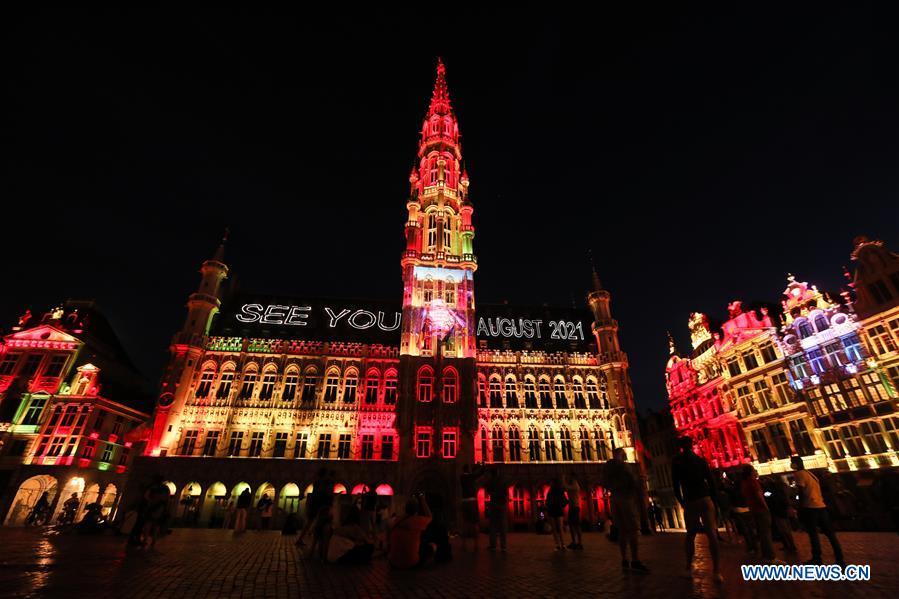 People watch a sound and light show at the Grand Place in Brussels, Belgium, July 29, 2020. A sound and light show was held at the Grand Place of Brussels to highlight Belgium's missing events in this summer due to the COVID-19 pandemic. (Xinhua/Zheng Huansong)
