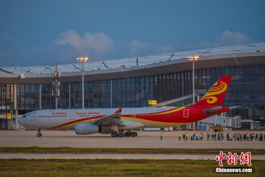 An aircraft conducts a test flight for the second phase of the expansion project of the Haikou Meilan International Airport in Haikou, south China's Hainan Province, July 30, 2020. The second phase of the airport expansion project started test flight on Thursday. (Photo/China News Service)