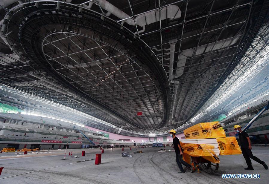 Photo taken on July 28, 2020 shows an inner view of the National Speed Skating Oval, also known as the "Ice Ribbon", in Beijing, capital of China. (Xinhua/Zhang Chenlin)