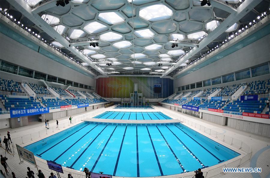 Photo taken on July 28, 2020 shows an inner view of the iconic "Water Cube" swimming venue from 2008, which now has become the "Ice Cube", a premier curling venue, in Beijing, capital of China. (Xinhua/Zhang Chenlin)