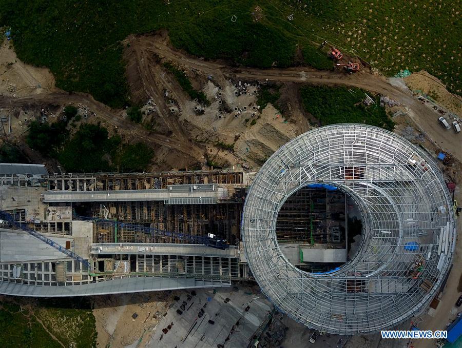 Aerial photo taken on July 30, 2020 shows the construction site of the National Ski Jumping Center in Chongli District of Zhangjiakou City, north China's Hebei Province. (Xinhua/Zhang Chenlin)