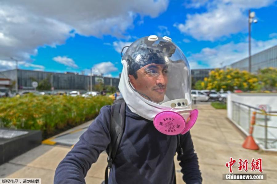 Colombian industrial designer Ricardo Conde wears a new ventilation mask against the spread of the coronavirus, Colombia, July 30, 2020. A group of Colombian entrepreneurs developed a bubble like the one used by astronauts to protect whoever uses it from the coronavirus pandemic. (Photo/Agencies)