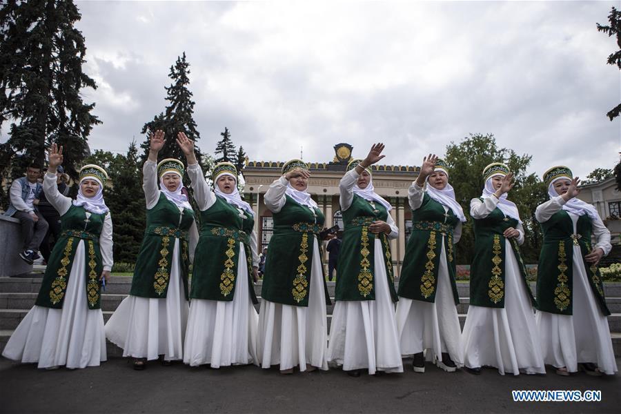 Artists perform at the Exhibition of Achievements of National Economy (VDNH) in Moscow, Russia, on Aug. 2, 2020. VDNH, an exposition, museum and recreational complex in Moscow, celebrated its 81st anniversary on Aug. 1 and Aug. 2 with a whole range of festive events. (Photo by Alexander Zemlianichenko Jr/Xinhua)