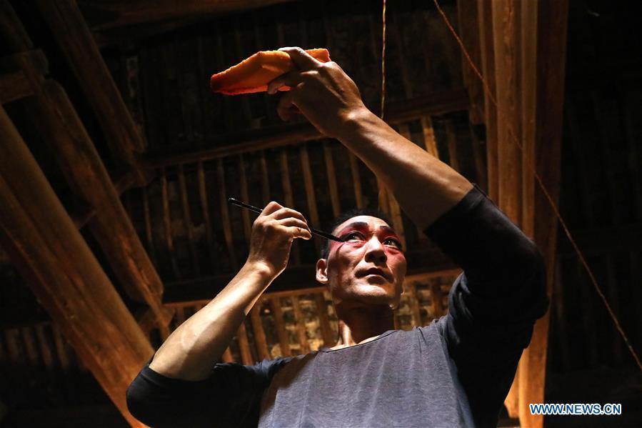 An actor from a local Jin opera troupe prepares for a show in Touquan Village, Jingxing County, Shijiazhuang City of north China's Hebei Province, Aug. 5, 2020. The Jingxing Jin opera troupe staged a performance on Wednesday in Touquan Village, the first of a series of over 60 touring performances in the rural areas of Shijiazhuang City during the summer holidays. (Photo by Liang Zidong/Xinhua)