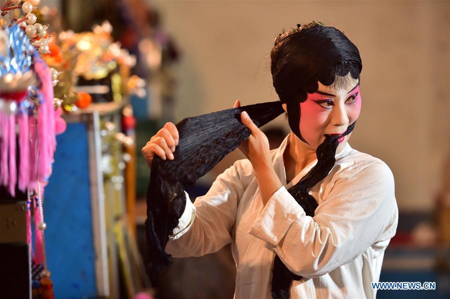 An actress from a local Jin opera troupe prepares for a show in Touquan Village, Jingxing County, Shijiazhuang City of north China's Hebei Province, Aug. 5, 2020. The Jingxing Jin opera troupe staged a performance on Wednesday in Touquan Village, the first of a series of over 60 touring performances in the rural areas of Shijiazhuang City during the summer holidays. (Photo by Zhang Xiaofeng/Xinhua)