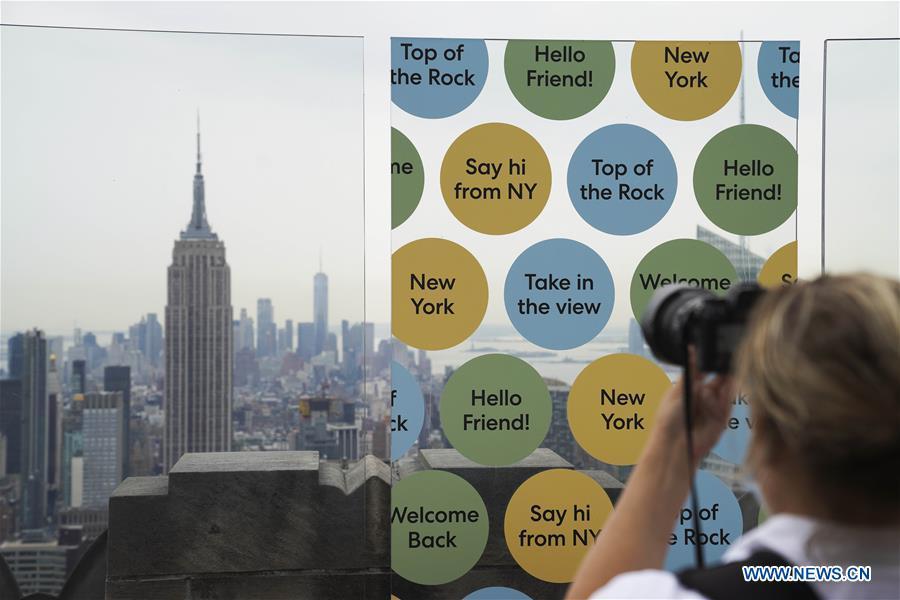A photographer takes photos of the view of Manhattan on Top of the Rock Observation Deck in New York, the United States, on Aug. 6, 2020. Top of the Rock Observation Deck, the famed viewing platform that sits atop 30 Rockefeller Plaza, reopened to the public on Thursday, after temporarily closing in March to help limit the spread of COVID-19. (Xinhua/Wang Ying)