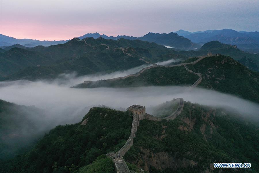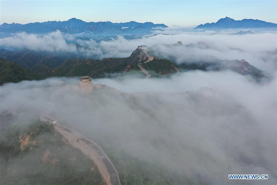 Aerial photo taken on Aug. 10, 2020 shows the Jinshanling Great Wall shrouded in morning mist in Luanping County of Chengde City, north China's Hebei Province. (Photo by Zhou Wanping/Xinhua)