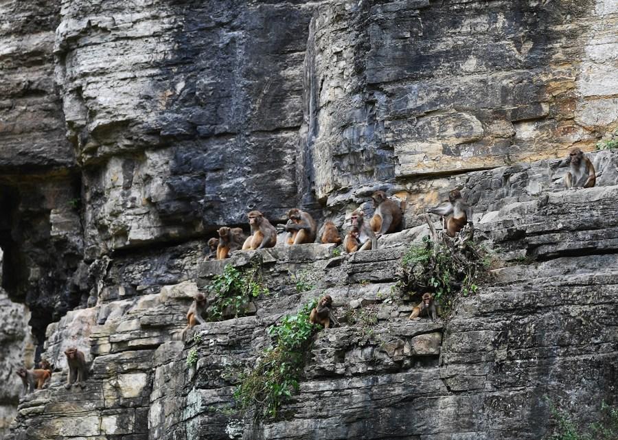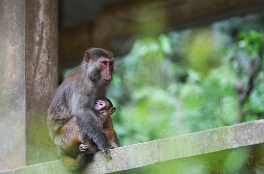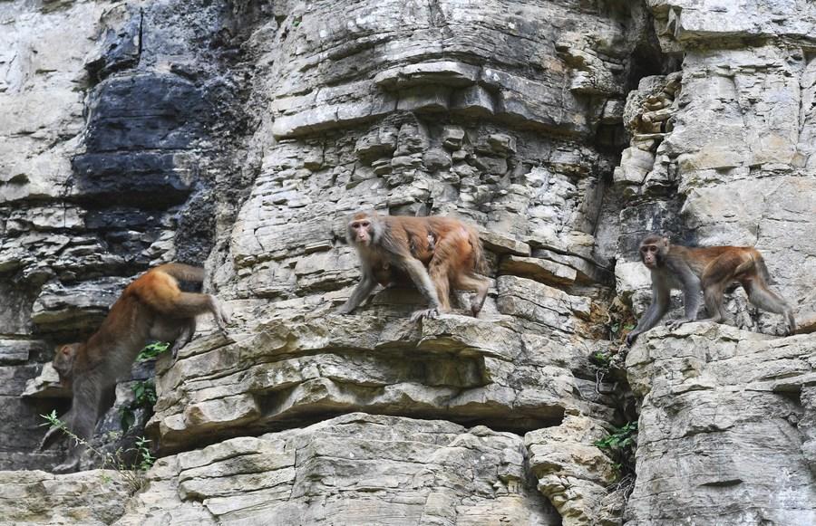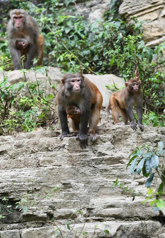 Wild macaques are seen at the bank of Wentang River in Tongjing Town, southwest China's Chongqing Municipality, Aug. 11, 2020. (Xinhua/Wang Quanchao)