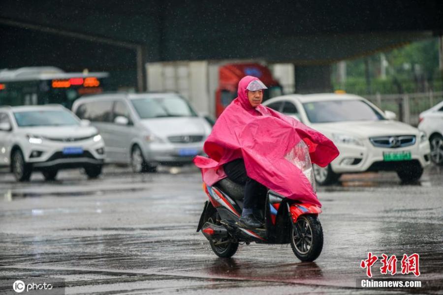 A man rides motorcycle in the rain in Beijing on August 12 . The Beijing weather authority announced on Wednesday morning that the capital will have strong rainfall which will start at around 2 pm in the afternoon and last till night.(Photo/IC)