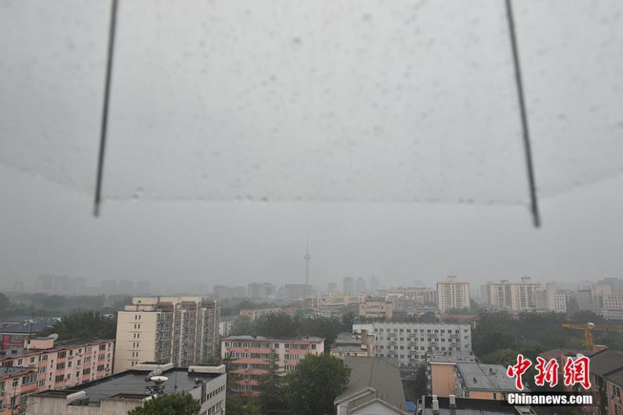 Photo taken on August 12 shows residential buildings in the heavy rain in Beijing. The Beijing weather authority announced on Wednesday morning that the capital will have strong rainfall which will start at around 2 pm in the afternoon and last till night.(Photo: China News Service/Li Jun)