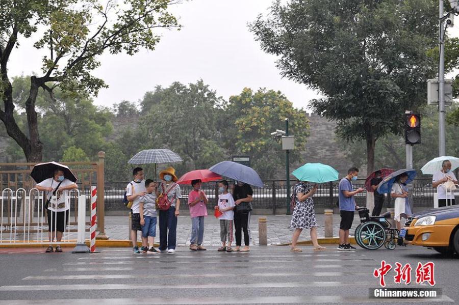 Photo taken on August 12 shows people with umbrellas in the heavy rain in Beijing. The Beijing weather authority announced on Wednesday morning that the capital will have strong rainfall which will start at around 2 pm in the afternoon and last till night.(Photo: China News Service/Li Jun)