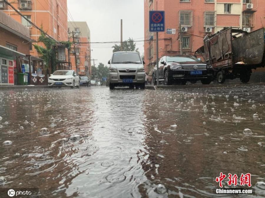 A car drives through a waterlogged section of a road in Beijing, on Aug 12, 2020. The Beijing weather authority announced on Wednesday morning that the capital will have strong rainfall which will start at around 2 pm in the afternoon and last till night. (Photo/IC)