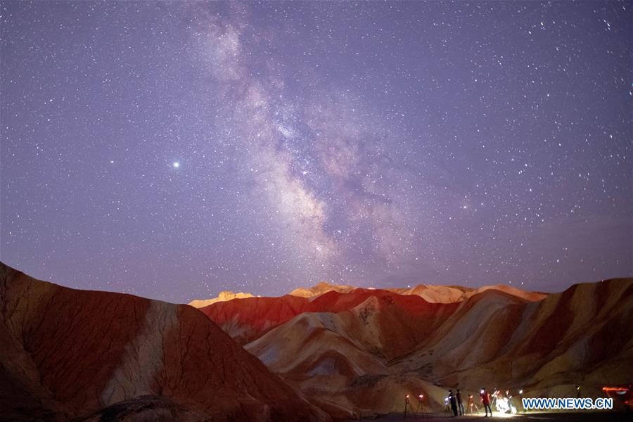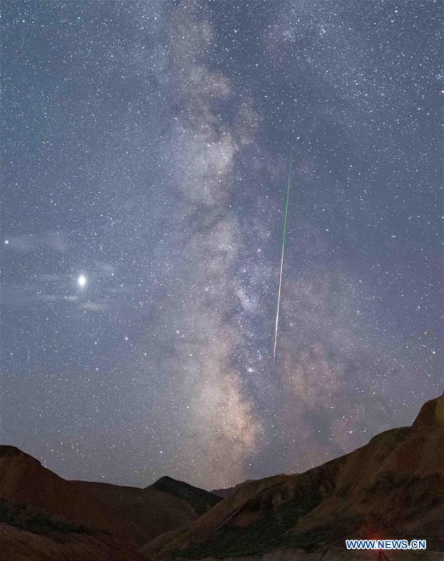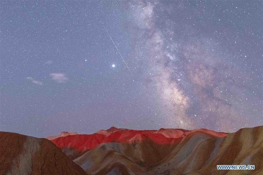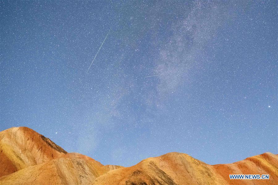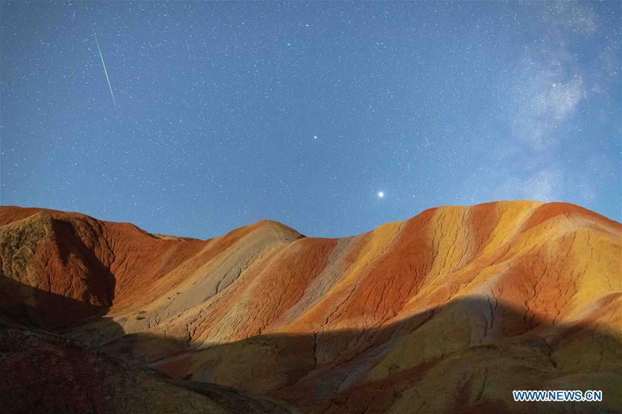 This long-time exposure photo taken on Aug. 13, 2020 shows the Perseid Meteor Shower in Zhangye Danxia National Geological Park in Zhangye, northwest China's Gansu Province. (Photo by Zhong Xiaoliang/Xinhua)