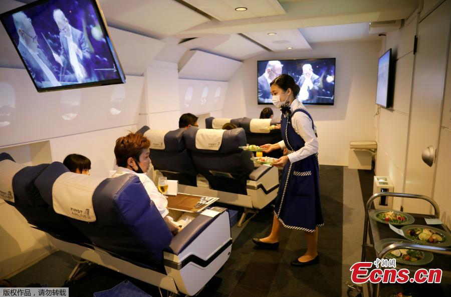 A staff dressed as a flight attendant serves meals to customers at First Airlines, that provides VR flight experiences, including 360-degree tours of cities and meals, amid the COVID-19 pandemic in Tokyo, Japan August 12, 2020. (Photo/Agencies)