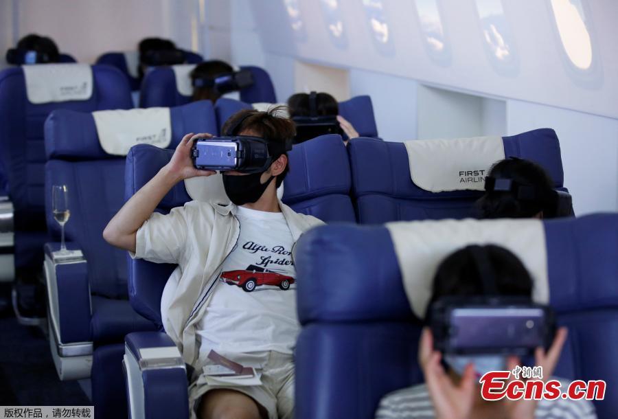 Customers in flight seats use virtual reality (VR) devices at First Airlines, that provides VR flight experiences, including 360-degree tours of cities and meals, amid the COVID-19 pandemic in Tokyo, Japan August 12, 2020. (Photo/Agencies)