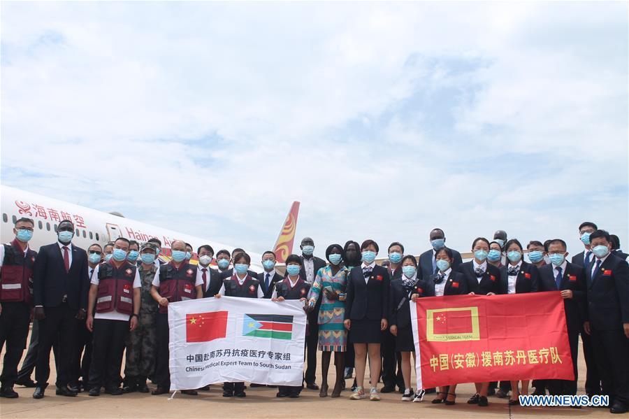 Chinese medical experts and South Sudanese government officials pose for a photo at Juba International Airport in Juba, South Sudan, on Aug. 19, 2020. A team of Chinese medical experts arrived in South Sudan on Wednesday to strengthen the east African nation's fight against the COVID-19 pandemic. (Photo by Gale Julius/Xinhua)