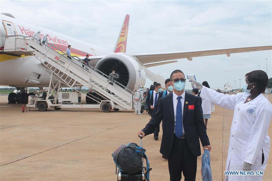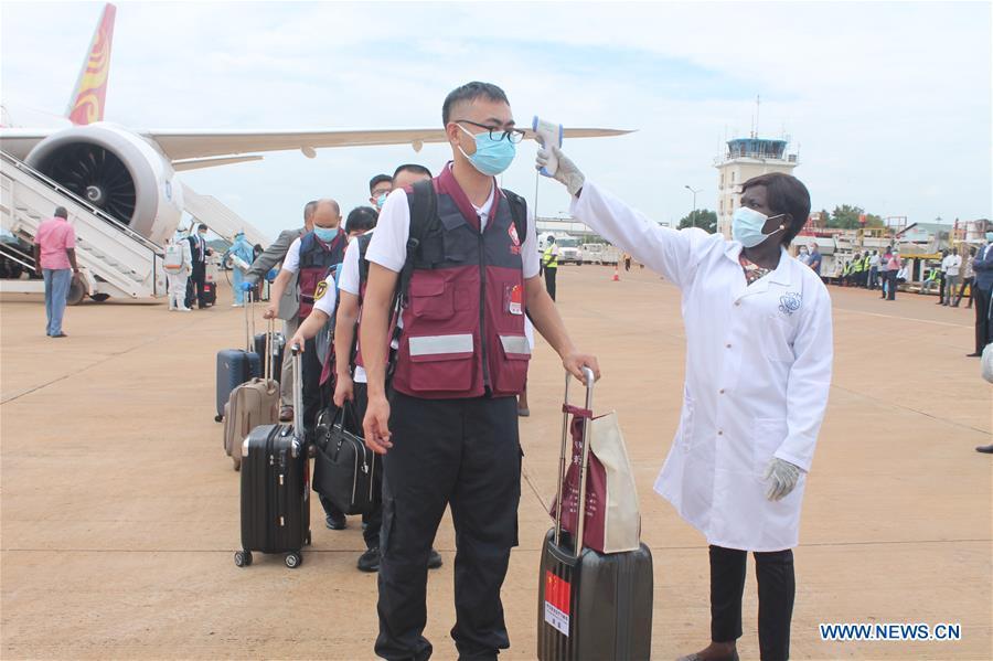 A health worker checks temperature of a member of Chinese medical team at Juba International Airport in Juba, South Sudan, on Aug. 19, 2020. A team of Chinese medical experts arrived in South Sudan on Wednesday to strengthen the east African nation's fight against the COVID-19 pandemic. (Photo by Gale Julius/Xinhua)
