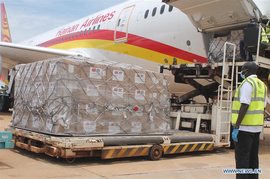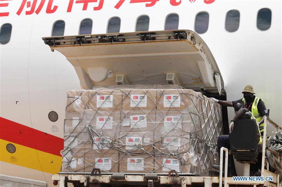 Medical supplies donated by Chinese government arrive at Juba International Airport in Juba, South Sudan, on Aug. 19, 2020. A team of Chinese medical experts arrived in South Sudan on Wednesday to strengthen the east African nation's fight against the COVID-19 pandemic. (Photo by Gale Julius/Xinhua)
