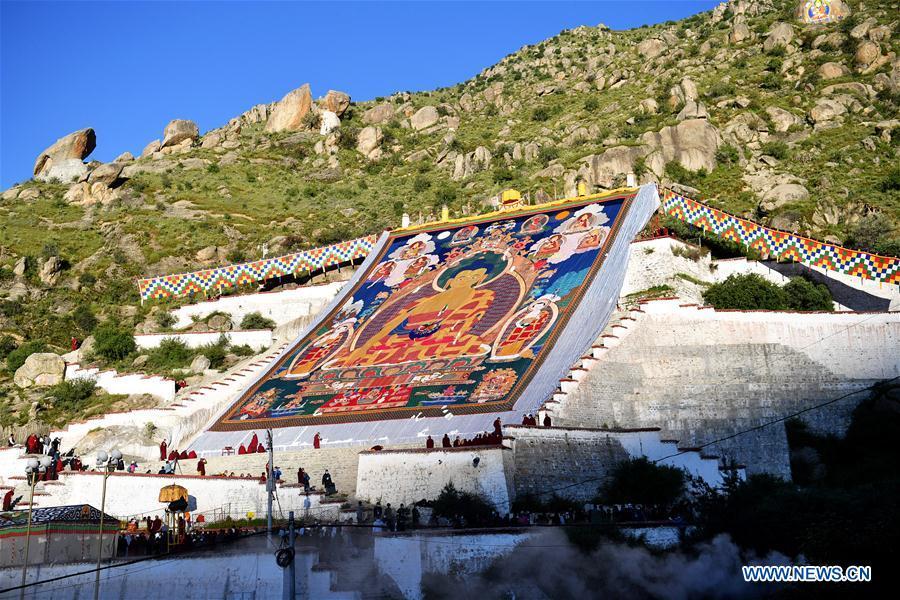 Photo taken on Aug. 19, 2020 shows a huge Thangka painting displayed during a traditional "sunning of the Buddha" ceremony at the Drepung Monastery in Lhasa, southwest China's Tibet Autonomous Region. Celebrations for the traditional Shoton Festival, or Yogurt Festival, began in Lhasa on Wednesday. (Xinhua/Zhan Yan)