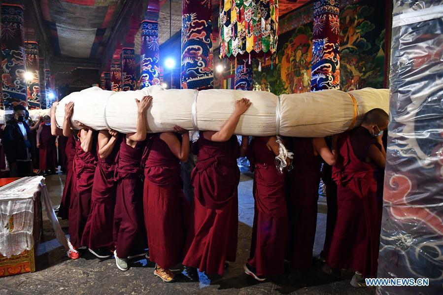 Buddhist monks carry a huge Thangka painting at the Drepung Monastery in Lhasa, southwest China's Tibet Autonomous Region, Aug. 19, 2020. Celebrations for the traditional Shoton Festival, or Yogurt Festival, began in Lhasa on Wednesday. (Xinhua/Zhan Yan)