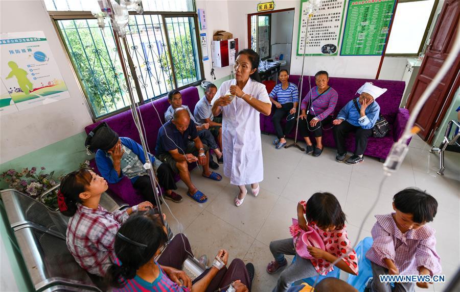 Luo Mu conducts intravenous drip for villagers at the clinic in Cuiwei Village of Longli County, Qiannan Buyi-Miao Autonomous Prefecture, southwest China's Guizhou Province, Aug. 19, 2020. Luo Mu, 49, a doctor of the Buyi ethnic group, works in Cuiwei Village of Longli County. Graduating from a medical school in 2004, she came back to the village serving as a medic. She converted her own living room into a clinic with the medical equipment she had purchased, to treat patients in the village. In 2007, Luo was employed at a newly founded clinic in the village with a population of 2,000, as the local medical conditions improved. Over the past 16 years, she has been treating about 30 patients on a daily basis and has revisited patients about 1,000 times each year. Luo is also a volunteer to promote the knowledge on epidemic prevention and control amid the COVID-19 pandemic. (Xinhua/Yang Wenbin)