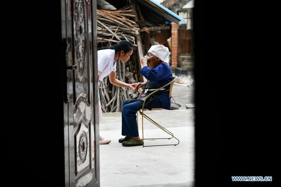 Luo Mu visits an elderly villager of the Buyi ethnic group in Cuiwei Village of Longli County, Qiannan Buyi-Miao Autonomous Prefecture, southwest China's Guizhou Province, Aug. 18, 2020. Luo Mu, 49, a doctor of the Buyi ethnic group, works in Cuiwei Village of Longli County. Graduating from a medical school in 2004, she came back to the village serving as a medic. She converted her own living room into a clinic with the medical equipment she had purchased, to treat patients in the village. In 2007, Luo was employed at a newly founded clinic in the village with a population of 2,000, as the local medical conditions improved. Over the past 16 years, she has been treating about 30 patients on a daily basis and has revisited patients about 1,000 times each year. Luo is also a volunteer to promote the knowledge on epidemic prevention and control amid the COVID-19 pandemic. (Xinhua/Yang Wenbin)